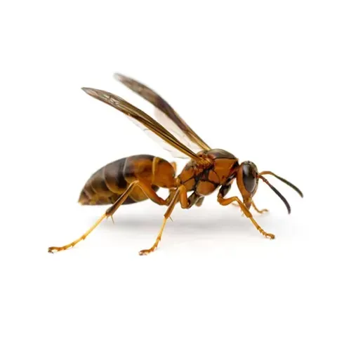 ¾–1 inch long, brown to reddish with yellow markings. Builds open, umbrella-shaped nests under eaves or decks; semi-aggressive when defending nest.